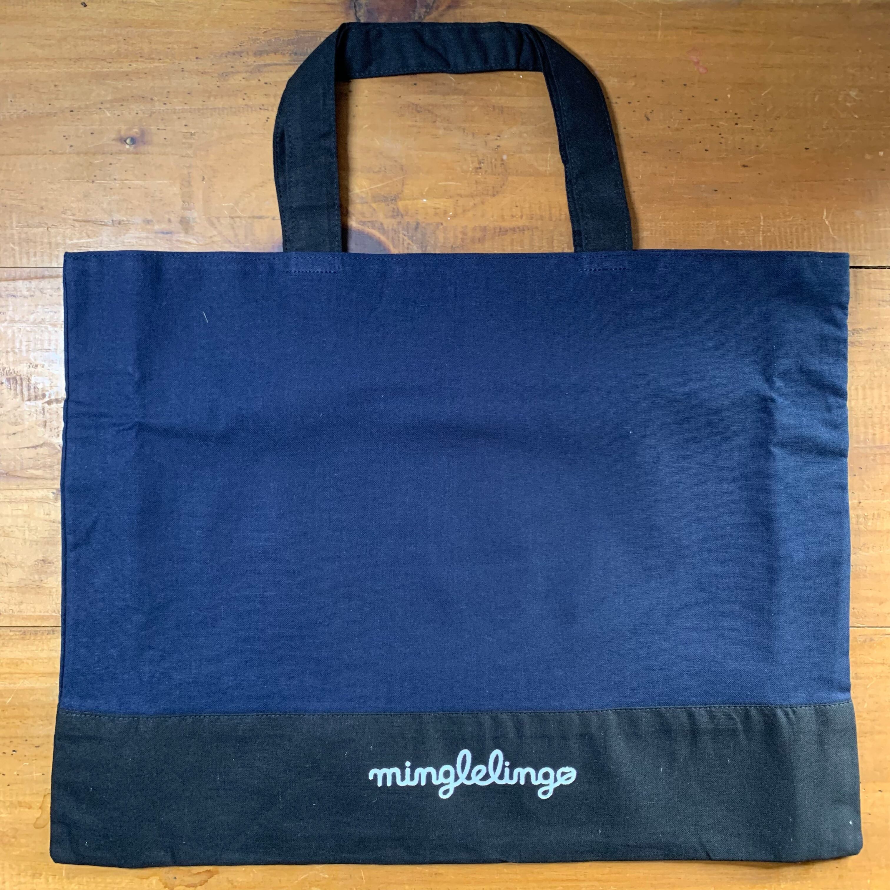 形:両面同じ形ですが、片方の黒地にminglelingoのロゴステンシルがあります。